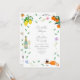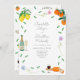 Bonito convite para casamento de cores aquáticas modernas e coloridas com simples botânicos, laranja e limão, tema ideal para um solarenga casamento de verão. A obra de arte original da artista Catherine Sweetman inclui folhagem, flores silvestres, queijo e vinho, notas musicais e flautas de espuma. Manuscrito Whimsical e roteiro tipográfico moderno com fácil personalização de modelos para acrescentar nomes, data e outras informações essenciais, juntamente com as iniciais da noiva e do noivo na ilustração do rótulo da garrafa de vinho espumante. A paleta de cores inclui limão, amarelo, laranja, verde, azul, roxo e rosa.