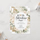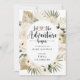 Um belo convite para chás de fraldas rústico com uma estrutura floral de estilo boho com rosas cor-de-rosa e folhas de palmetto. Matizes terríveis de creme e verde. Que a aventura comece com um pequeno coração rosa.