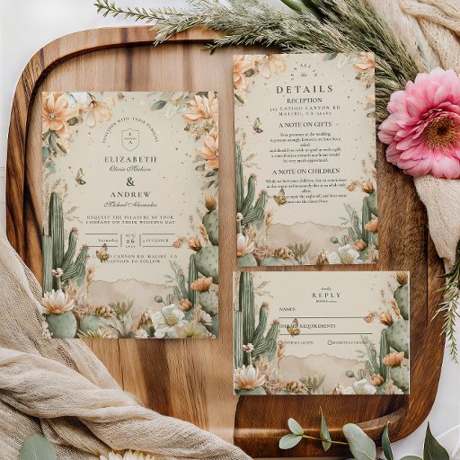 Uma design romântica de casamento inspirada no deserto com cacto de aquarela, florais de pêssego macio, borboletas, e cenário de montanha mudada. Perfeito para boho, sudoeste e casamentos russos ao ar livre.