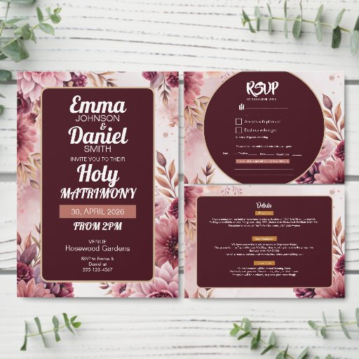 Invite your guests with the Boho Dreams Holy Matrimony Wedding Invitation, featuring romantic florals in shades of pink, maroon, and cream against an elegant backdrop. This design embodies free-spirited charm and artistic sophistication, blending whimsical details with refined typography. Perfect for outdoor ceremonies, desert-inspired celebrations, or bohemian gatherings, the Boho Dreams suite reflects individuality, creativity, and effortless elegance. Coordinated with the full suite, this invitation sets the tone for a soulful and stylish celebration.