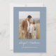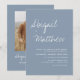 Personalize este convite para Na moda boho Simples Elegante Dusty Azul e Branco com sua mensagem e detalhes com uma foto elegante no verso. Este convite minimalista inclui a tipografia da escrita à mão na moda com uma cor moderna para a celebração especial do dia do casamento.