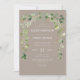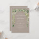 Este convite de casamento da na moda rustic apresenta uma delicada marca de cor d'água eucalipto verde. Personalize-o com os nomes dos casais em fontes brancas sans serif em um fundo taupe neutro. A parte traseira da placa está esticada.