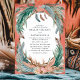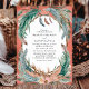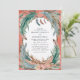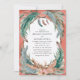 Capturar a essência de uma celebração livre com este convite de boho para casamento, com uma coroa de penas, folhas e flores cercando uma área central de texto. Um apanhador de sonhos adiciona um toque caprichoso, colocado sobre um fundo de coral macio. Os tons de terra e os elementos naturais criam uma atmosfera serena e relaxada, perfeita para casais que buscam um estilo de casamento único e inspirado na natureza.