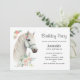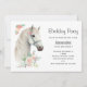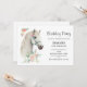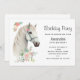 Um convite de aniversário com uma ilustração mágica de uma bela cabeça de cavalo branca. Cercado por pequenas flores cor-de-rosa giras. Boho elegante para amantes de cavalos.