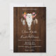 Boho floral e pasteleiro de penas convite para casamento de madeiras rústicas de vaca. Estes convites de casamento estilo boêmico apresentam um crânio de vaca com flores e penas.