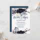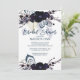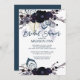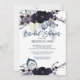 Lindas flores azuis e roxas adornadas com penas com um moderno chá de panela com letra chic