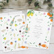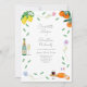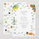 Convite de casamento em aquarela moderno, colorido e encantador, com tema de queijo e vinho boêmio francês, com simples elementos botânicos e tema de cítricos laranja e limão, ideal para um casamento ensolarado de verão com tema europeu. A arte original da artista Catherine Sweetman inclui folhagens, flores silvestres, queijo e vinho franceses, a bandeira francesa, notas musicais e taças de vinho espumante borbulhante. Caligrafia caprichosa e tipografia moderna com modelos fáceis de personalizar para adicionar nomes, data e outras informações essenciais, juntamente com as iniciais dos noivos na etiqueta da ilustração da garrafa de vinho espumante. A paleta de cores inclui limão, amarelo, laranja, verde, azul, roxo e rosa.