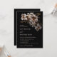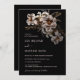 This dark moody wedding invitation features neutral colors and off white flowers and greenery on a black background.