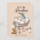 Um belo convite de chá de fraldas rústico com um berço de bambu estilo boho em fundo de madeira. Matizes terríveis de siena e bisque.