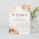 Estes lindos convites de batismo apresentam estilo boho moderno e elegante caligrafia cor de vinho. Buquês boêmios rústicos de flores laranja, pêssego, blush e cinza e folhas botânicas neutras decoram os cantos, com sutis salpicos de aquarela combinando em um fundo suave e rosa. Uma falsa cruz dourada é apresentada no topo. Embora seja especialmente bom para um batismo no outono, este lindo design será perfeito em qualquer época do ano.