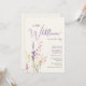 Um convite à chá elegante e caprichoso feito por uma menina, mocinha, com "uma pequena flor selvagem está a caminho", escrito numa mistura de tipografia moderna de cinzas moles e uma escrita púrpura na moda, e um buquê de aquarela inspirado no véu, de flores silvestres roxas, rosa e amarelas.