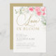 Um elegante e moderno chá de panela "Love is in Bloom" com um buquê exuberante de rosas de aquarelas, orquídeas, eucalipto e alguma outra folhagem de ouro (não ouro real, este é um efeito digital), assim como a caligrafia moderna.