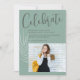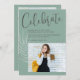 Anuncie o dia especial do seu formando com este cartão de graduação minimalista com tons verdes de sábio suaves, um roteiro manuscrito e fotos pessoais. Projetado para segundo grau ou formandos, este modelo de na moda permite atualizar facilmente os detalhes do evento e carregar as fotos favoritas do seu formando. Ideal para enviar mensagens a amigos e familiares ou para entregar-se às festas de formatura. Torne-o exclusivamente seu com simples personalização.