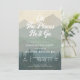 Um convite de festa de formatura de vassoura com montanhas azuis e fundo da floresta sobrepostos com fonte retrô branca e o título editável "Oh, os lugares que ele irá"