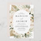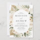 Convites de casamento floral tropical elegantes com seus nomes e detalhes de casamento no centro do design. Um quadro oval de flores tropicais creme, folhas de palma, grama de pampas, e folhagem verde rodeia sua informação de casamento Os convites de boho neutro são perfeitos para o seu casamento na praia de verão.
