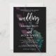 O convite romântico de casamento bócio apresenta penas coloridas e um fundo preto.