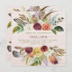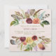 Este convite do casamento do na moda caracteriza flores na moda da aguarela nas máscaras de Borgonha, de marsala, de laranja, de amarelo, e de branco junto com penas do boho e nos lotes das folhas verdes em um fundo de madeira claro do olhar.