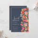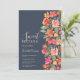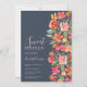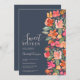 Boho queimado orange ternura cor verde doce floral 16 convite com terracota pintada à mão, cor-de-rosa, pêssego, flores amarelas e vermelhas com folha verde e folhagem verde em fundo azul escuro com tipografia escovada.