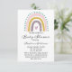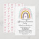 Um adorável arco-íris de vassoura com rosa, roxo, ouro, teal, corações e pontos adornam este belo convite de chá de fraldas para uma menina. As costas têm corações cor-de-rosa.
