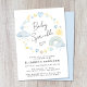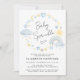 O convite de bébé bimétrico apresenta aquarelas azuis e amarelas de um arco-íris, sol, corações, estrelas, luas e nuvens.