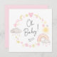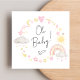 Um convite de chá bichinho bíblico que apresenta cores-d'água pastel rosa e amarelas de um arco-íris, sol, corações, estrelas, luas e nuvens e "Oh Baby!" em um roteiro de caligrafia na moda. No verso, personalize o nome da futura mãe em um roteiro chic e adicione os detalhes do chá em uma simples tipografia moderna.