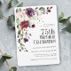 Comemore um aniversário de 75 anos em estilo bonito com este convite de aniversário floral de aquarela único. Ele tem um adorável buquê floral na combinação de cor na moda de vermelho burgundy, rosa-pinto-pincel, roxo de ameixa e pêssego com um verde sumptuoso espalhado por todo o lado. Faz uma escolha maravilhosa para comemorações do verão de médio, para cair e durante os meses de inverno. O reverso do convite é adornado com um buquê correspondente. Este convite está disponível tanto como um convite impresso como um download digital para sua conveniência!