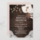 O chá de panela rústico de Boho apresenta jarras gigantes bege e flores brancas e folhas de palma secas sobre fundo de madeira.