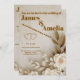 An elegant and refined wedding invitation suite, perfect for a modern fall or winter wedding. This design features delicate, neutral-toned florals and rich, rustic leaves, complemented by a luxurious marble background