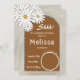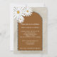 Um cartão de convite de aniversário elegante com três grandes margaridas brancas, uma forma marrom-caramelo e uma forma de arco prateado mostrada num padrão de vidro branco-prateado. No canto inferior direito, há uma imagem personalizada mencionando a idade da pessoa de aniversário.