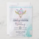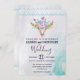 Um convite para o casamento com turquesa e fundo de aquarela pastel. Um crânio bicho-papão com um buquê floral sobre sua cabeça e pequenas borboletas se espalhando. Uma bela borda decorativa com pequenas formas de lágrimas em azul claro.