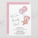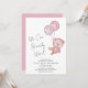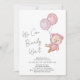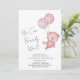 Convite para chá de menina Boho apresentando uma ilustração de aquarela fofa de um ursinho rosa flutuando com balões e "Nós podemos esperar mais cedo" em um roteiro de caligrafia manuscrito.