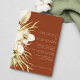 Trendy white floral, palma tropical, e pampas herbáceas de cor verde-d-água, convite para o casamento com uma tipografia moderna sobre um elegante fundo de terracotta assado. +++++ Adequado para jardins de Verão ou para casamentos contemporâneos de destino no deserto à beira-mar.