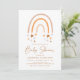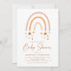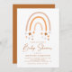 Convites de chá de bebê bonitos com arco-íris estilo "boho" e estrelas em tons de terracota, laranja e pincel. Personalize os convites do chá de fraldas boho com o nome da futura mãe, os detalhes do evento e as informações do registro. Os convites são perfeitos para chás de fraldas neutros em termos de gênero!