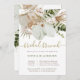 Este convite para o brunch do chá de panela de casamento de tendências apresenta flores e palmeiras lindas e tropicais de aquarelas, e folhas botânicas e folhagem verdes. A caligrafia falsa em ouro acrescenta um toque elegante, e o texto principal é uma mistura natural de massa verde e marrom, tudo sobre fundo branco. A parte de trás do convite contém mais gráficos florais em um simples fundo branco.