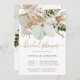 Esta trendy chá de panela de casamento apresenta lindas flores e palmeiras tropicais de aquarela, folhas botânicas verdes e folhagem. A caligrafia falsa em ouro acrescenta um toque elegante, e o texto principal é uma mistura natural de massa verde e marrom, tudo sobre fundo branco. A parte de trás do convite contém mais gráficos florais em um simples fundo branco.