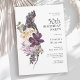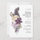 Um convite de aniversário floral de cor aquática tropical boho único, 50º, com uma paleta de cor sumptuosa, roxa, bege (esbranquiçado) e verde. Um belo papagaio roxo senta num buquê luxuoso de flores tropicais exóticas. O esquema de cores é perfeito para eventos de aniversário em todas as estações e tem um encanto rústico. As belas flores dessa design elegante moderna incluem proteas exóticas, orquídeas, dálias e folhas tropicais. Personalize o modelo de texto com os detalhes do evento. Você pode editar a idade de qualquer comemoração de aniversário.