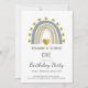 Arco-íris de aquarela de boho bonito com corações dourados convite azul de primeiro aniversário para um menino. Estilo moderno simples e bonito.