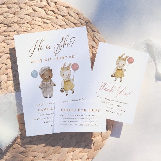 Este adorável convite revela "Ele ou ela? O que será o bebê?" no topo do cartão, seguido de uma ilustração aquosa de um filhote de ursinho vestindo macacões e uma gravata arco segurando um balão azul, e um coelhinho de menina com um vestido pequeno e arcos em seu cabelo segurando um balão rosa. O esquema de cores boho é neutro em termos de gênero, com exceção dos balões rosa e azul. Os detalhes do evento são exibidos abaixo. Cartões que se invertem a um padrão de produtos para bebês a aquarelas, incluindo ursinho de pelúcia, chocalho, garrafa, brinquedos, meias e calçados, pacificador e muito mais. Veja a coleção ligada nesta página para itens correspondentes ou visite a nossa loja para mais convites para chuveiros de bebês.