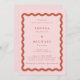 Um convite de casamento moderno e na moda, com uma vibração retrorreflectora, com um quadro ondulante em terracota, com fundo cor-de-rosa pincelado, com texto em terracota. Adicione um QR ao contrário para direcionar os convidados ao seu site de casamento.