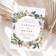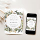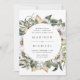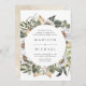Convite de casamento floral único e elegante que inclui seus detalhes de casamento cercados por flores brancas de aquarela e folhagem exuberante em tons ricos de verde, bege e terra marrom. O convite reverte para um fundo de aquarela bege claro.
