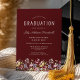 Uma bela borda floral de aquarela de flores silvestres decora a borda inferior deste convite de festa de formatura de vassouras. Personalize o texto branco em um fundo vermelho burgundy, com o nome do formando em script de escrita manual; o ano escolar e de aula em sans serif; e os detalhes de data, local e RSVP em serif. A parte de trás do cartão é uma arma sólida.