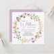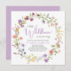 Um convite elegante para uma menina, apresentando "um pouco de flor selvagem está a caminho" numa mistura de tipografia moderna de cinzas moles e um roteiro de lavanda na moda, e aquarelas inspiradas no livro de uma coroa de flores roxas, cor-de-rosa, pêssego e amareladas e uma borboleta roxa. Personalize o nome da mãe e os detalhes do chá em lavanda simples e tipografia de cinza.