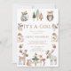 Ao estilo do macho pintou animais de floresta "é uma menina", convite ao chá de fraldas, com animais de floresta, cogumelos, bolotas e árvores cercando o texto do convite. Tema de animais de floresta de cor aquosa.
