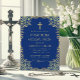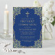Este elegante convite à primeira comunhão de ouro azul real com ar vintage, recomendado para um menino, tem um quadro de folha de ouro falso em ornamentado com folhas de ouro sobre fundo azul real. Acima do texto, há uma cruz religiosa em folha de ouro falsa. Todo texto pode ser personalizado e tem uma cor amarela ouro semelhante à imagem falsa dourada. A safra, ornamentado de folhas de ouro é baseada em um antigo enlace de cobrir de livros, "O século XVIII Suas Instituições, Alfândegas e Figurinos" de Paul LaCroix, publicado em 1876, agora no dominio público.