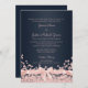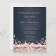 Gala cor-de-rosa e arco sobre o convite de casamento azul-marinho, festivo e colorido, com texto rosa tradicional.