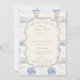 Um doce design inspirado no vintage que apresenta laços azuis delicados, detalhes de listras suaves e ilustrações encantadoras do jardim de mirtilos. Arte no estilo Toile com animais adoráveis e cestas de frutas cria uma sensação clássica de livro de histórias em uma paleta de azul suave em pó. A moldura central ornamentada adiciona elegância, mantendo o visual geral leve, refinado e atemporal. Perfeito para um chá de bebê com um tema de jardim suave e um toque de charme tradicional.