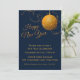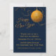 Um convite festivo para a véspera de Ano Novo com uma bola de espelho de ouro cintilante, florescimento de ouro e texto de Feliz ano novo em letras brilhantes sobre fundo azul de marinho rico. Fácil de personalizar com as informações da sua parte. (impressões de convite achatados e sem brilho real ou faíscas.) Criado com gráficos por ©ZaZa/SRefugo e Tubos