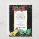 Convite de aniversário festivo do doce 16 da bola de mascarada feito no preto, com os gráficos do brilho dourado e três das máscaraes protectoras ornamentado que decoram a parte dianteira. Uma área de texto branca moldada ouro tem o texto inteiramente feito sob encomenda preto pronto para personalizar, para seu evento. Excelente para festas de aniversário, partidos do mascarada, Dia das Bruxas, carnaval, e carnaval.
