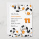 Este convite de festas temático de futebol giro para uma festa de aniversário ou de equipe e apresenta clusters de bolas de futebol laranja, preto e branco nas bordas superior e inferior na frente e um cluster de solteiros que cobre a parte de trás do convite - personalize os detalhes da festa em um fundo branco - por katz_d_zynes