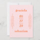 Convite moderno de casamento, com estilo ousado e tipográfico, com um nome no topo, um no fundo e seu encontro no meio. Os detalhes do evento estão em ambos os lados. O tema de cores do arco-íris (cor-de-rosa e laranja) e pode ser alterado na ferramenta de edição de design. Este convite para o estilo tropical casual é excelente para um casamento informal de primavera ou verão.
